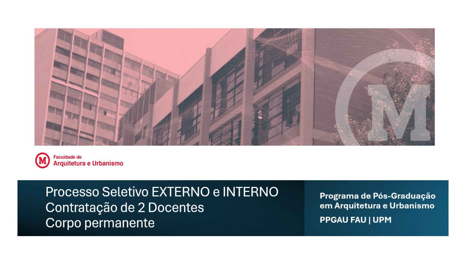 O Programa de Pós-Graduação em Arquitetura e Urbanismo (PPGAU) da Faculdade de Arquitetura e Urbanismo (FAU) da Universidade Presbiteriana Mackenzie está com processo seletivo externo e interno aberto para a contratação de dois docentes permanentes. A seleção visa fortalecer o quadro docente da pós-graduação stricto sensu da instituição.